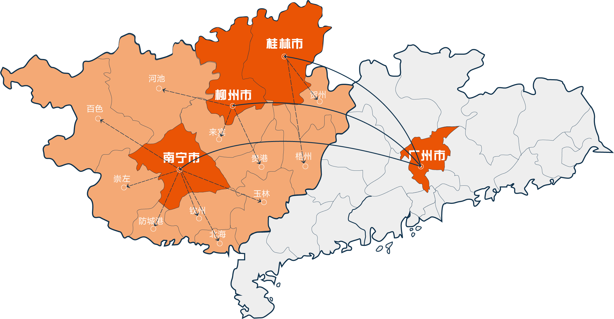 广州至南宁、柳州、桂林、贵港、玉林、贺州、梧州、藤县、东兴、凭祥、防城、合浦、北海、钦州、广西全境、柬埔寨、越南全境。